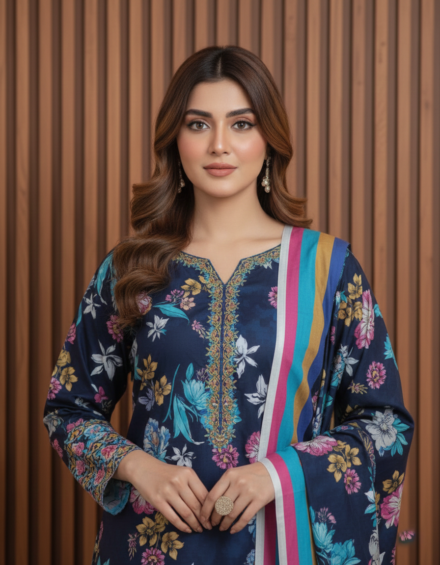Keep your winter wardrobe trendy with this BAROQUE Digital Khaddar suit. Designed with a beautifully printed khaddar shirt, matching digital dupatta, and a soft trouser for a complete seasonal look.