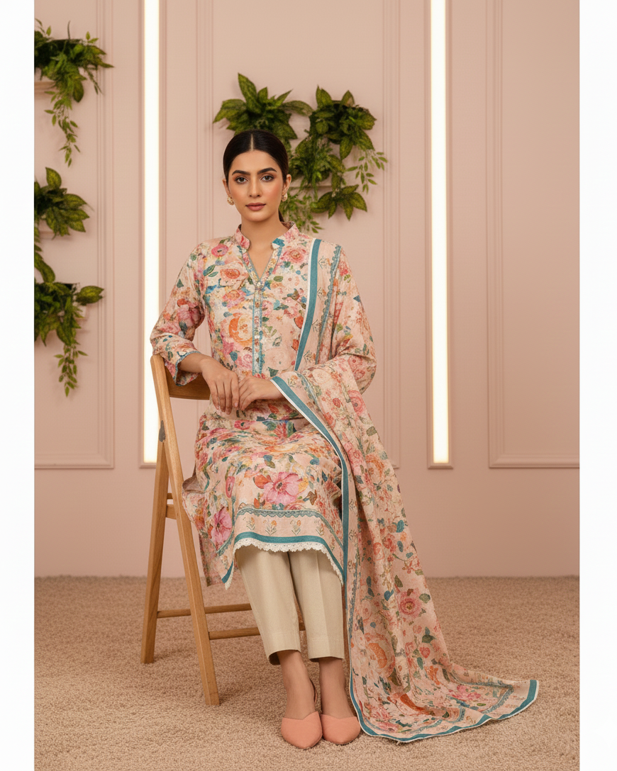 Elevate your summer wardrobe with this SAYA 3-piece premium cotton khaddar suit. Featuring a wide-width printed shirt, a soft printed dupatta, and a comfortable dyed trouser — perfect for style, comfort, and breathable seasonal wear.